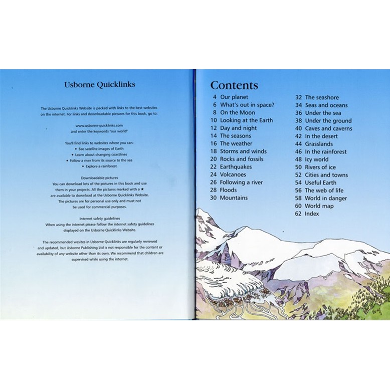 1. Nội dung Sách – First Encyclopedia Of Our World First Encyclopedia Of Our world là cuốn sách Bách Khoa tổng hợp về thế giới động vật dưới nước dành cho các bé từ 9 tuổi, có kiến thức nền tảng tiếng Anh tốt. Trong cuốn sách này, các bé sẽ tìm thấy câu trả lời cho những điều thú vị như sau: – Tại sao lại có đêm tối? – Các kiểu khí hậu và bốn mùa trong năm? – Hệ sinh thái theo từng dạng địa hình của Trái Đất? … Các vấn đề trong sách được trình bày đơn giản, dễ hiểu, kèm theo hình ảnh minh họa thực tế. Ngoài ra sách còn có thêm nhiều gợi ý trên Internet để các bé tìm hiểu mở rộng kiến thức 2. Thông tin Sách – First Encyclopedia Of Our World Độ tuổi 9+ Bìa cứng ISBN: 9781409514305 Số trang 64 Kích thước: 276 x 216mm Tác giả David Hancock Năm xuất bản 2018 Nhà xuất bản Usborne