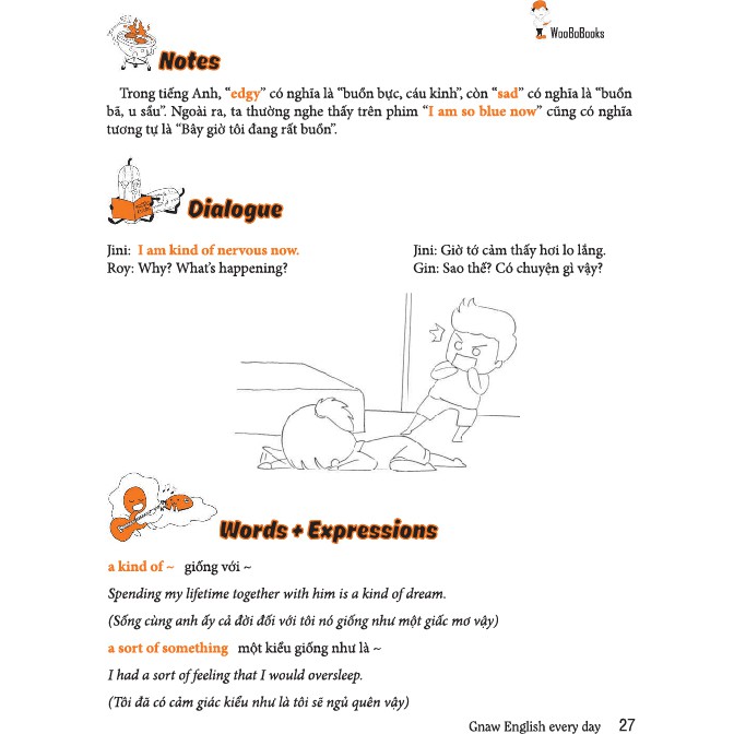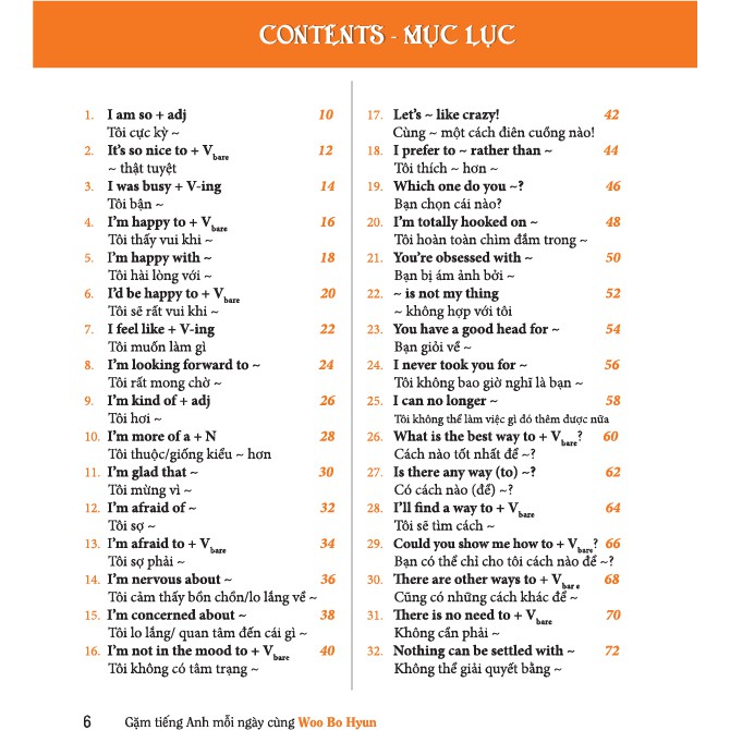 Gặm tiếng Anh mỗi ngày cùng Woo Bo Hyun Tác giả: Woo Bo Hyun Số trang: 214 Ngày xuất bản: 07/2018 Lưu ý: Sách có kèm file Audo-mp3 Kênh14: http://kenh14.vn/sao-phim-han-gia-dinh-la-so-1-phan-khich-voi-quyen-sach-nao-o-viet-nam-20181031173359796.chn Dành cho các bạn: + Mới bắt đầu học tiếng Anh + Mất gốc tiếng Anh + Đã học tiếng Anh hàng năm trời, biết hàng ngàn từ vựng, rất nhiều ngữ pháp chuyên sâu nhưng mãi mà vẫn chưa nói được tiếng Anh, bế tắc khi giao tiếp tiếng Anh (tình trạng chung của phần lớn người học tiếng Anh ở Việt Nam) + Muốn ghi nhớ ngữ pháp tiếng Anh cơ bản một cách dễ dàng + Muốn học những cụm từ tiếng Anh thông dụng trong đời sống hằng ngày + Muốn luyện phản xạ tiếng Anh cơ bản ⇒ giao tiếp tiếng Anh lưu loát ở trình độ cơ bản + Đang luyện thi Flyers, PET, Ielts 4.5+, Toeic 550+, Toefl 50+ , chứng chỉ A1, A2, B1 + Chuẩn bị cho các kì thi học kì và đại học tiếng Anh + Chuẩn bị xin việc làm, đi du lịch hay đi du học + Độ tuổi thích hợp học “Gặm” là từ 9 – 65+ “GẶM” CÓ GÌ KHÁC BIỆT? + Giúp bạn học ngữ pháp cơ bản (đồng thời là các mẫu câu giao tiếp căn bản) một cách dễ dàng, ghi nhớ ngữ pháp nhanh chóng và mãi mãi, thông qua việc vận dụng được tiếng Anh trong cuộc sống hằng ngày cũng như trong công việc. Các câu ví dụ minh họa với từ vựng cơ bản, thông dụng, giúp bạn cảm thấy việc học ngữ pháp dễ dàng, không cứng nhắc, không còn mệt mỏi. Ví dụ: I’m busy + V-ing , I’m too + Adj + to V-bare, I’m getting used to + N/V-ing, I’m looking forward to + Ving, I feel like + V-ing, I’m afraid of/for/to/that, … Từ đó tăng tốc độ nói và viết của bạn, KHÔNG CÒN SAI NỮA, KHÔNG CÒN QUÊN NỮA vì cấu trúc ấy đã in sâu vào não bạn rồi, khi cần là có thể bật ra nói/viết ngay được luôn, không cần phải cố gắng lôi nó ra như trước đây nữa. + Giúp bạn học nhiều từ, cụm từ cơ bản thông dụng trong đời sống hằng ngày như: tired, stressed out, jealousy, do my homework, fix my computer, help my parents, have lunch with friends, pay for lunch, have a Vietnamese coffee, have no boyfriend, feel guilty… Đây là những từ, cụm từ KHÔNG THỂ KHÔNG BIẾT khi giao tiếp, viết tiếng Anh hay tham gia các kì thi Anh ngữ. Những cụm ngắn và đơn giản sẽ giúp chúng ta nhớ lâu hơn, và chỉ cần luyện tập một chút là ai cũng có thể sử dụng cụm từ ấy vô cùng thành thạo rồi. + Giúp bạn hình thành phản xạ giao tiếp: Không còn là những bài giảng khô khan như công thức, “Gặm” đưa chúng ta đến một thế giới sống động hơn, nơi chúng ta có thể thỏa sức vận dụng những cấu trúc ngữ pháp (mẫu câu giao tiếp) vào nhiều tình huống khác nhau chỉ bằng cách thay đổi một số từ hay cụm từ. Bên cạnh lời giảng giải dễ hiểu và gần gũi, “Gặm” còn bày cho chúng ta những câu ví dụ thú vị để minh họa cho phần giải thích của mình. Từ những ví dụ đó, bạn có thể dễ dàng học và luyện tập theo. Việc lặp đi lặp lại mẫu câu giao tiếp kết hợp từ, cụm từ cơ bản giúp bạn hình thành phản xạ, giúp nói lưu loát và viết trơn tru tiếng Anh. Các bạn phải học thật nhiều mẫu câu giao tiếp thì mới phản xạ được, một khi đã học nhiều, tất cả các mẫu câu như được in sẵn trong não bộ của bạn, khi cần là có thể bật ra ngay được luôn. Thật sự thì nếu muốn nói chuyện được với người nước ngoài, các bạn cần phải phản xạ được ngay lúc đó. Khi có người hỏi bạn chỉ một câu đơn giản thôi, nếu bạn chưa bao giờ học các mẫu câu giao tiếp, bạn không thể nói ngay được, hoặc phải mất rất nhiều thời gian để sắp xếp và ráp từng từ lại với nhau. Do đó, càng ngày các bạn càng nản, cảm thấy bế tắc và không muốn nói tiếng Anh, kiến thức càng ngày càng trôi vào quên lãng và bạn rơi vào tình trạng mất gốc. + Những đoạn đối thoại (Dialogue) tuy ngắn nhưng được minh họa rất sinh động: Hình ảnh đơn giản, không cầu kỳ nhưng cũng đủ để người xem thích thú và tò mò với những câu chuyện dễ thương được khéo léo lồng những câu chuyện rất đời thường. Người xem hẳn có thể thấy hình bóng của chính mình đâu đây qua những câu chuyện của người bố Woo và hai cô con gái Luli và Jini, về hai anh chàng si tình Roy và Gin. Các nhân vật ấy đã giúp tạo nên một bức tranh thật đáng yêu về gia đình, bạn bè, tình yêu, và đồng nghiệp – điều mà chưa có quyển sách tiếng Anh nào làm được. + Phần Notes và Words + Expressions mở rộng kiến thức, kích thích trí tò mò: Phù thủy tiếng Anh Woo Bo Hyun đã chọn 2 mục này làm phần mở rộng kiến thức, không chỉ giúp chúng ta có thể tìm tòi sâu hơn về chủ đề của bài học, mà còn kích thích sự tò mò của chúng ta, thôi thúc chúng ta muốn tìm hiểu sâu hơn nữa từ những nguồn khác, từ đó tạo động lực cho chúng ta luôn luôn tìm tòi, học hỏi những điều mới mẻ. CHÚ Ý: COMBO ĐẦU TIÊN ĐỂ CHINH PHỤC TIẾNG ANH GỒM: + Cấu trúc ngữ pháp căn bản, đơn giản (mẫu câu giao tiếp hằn