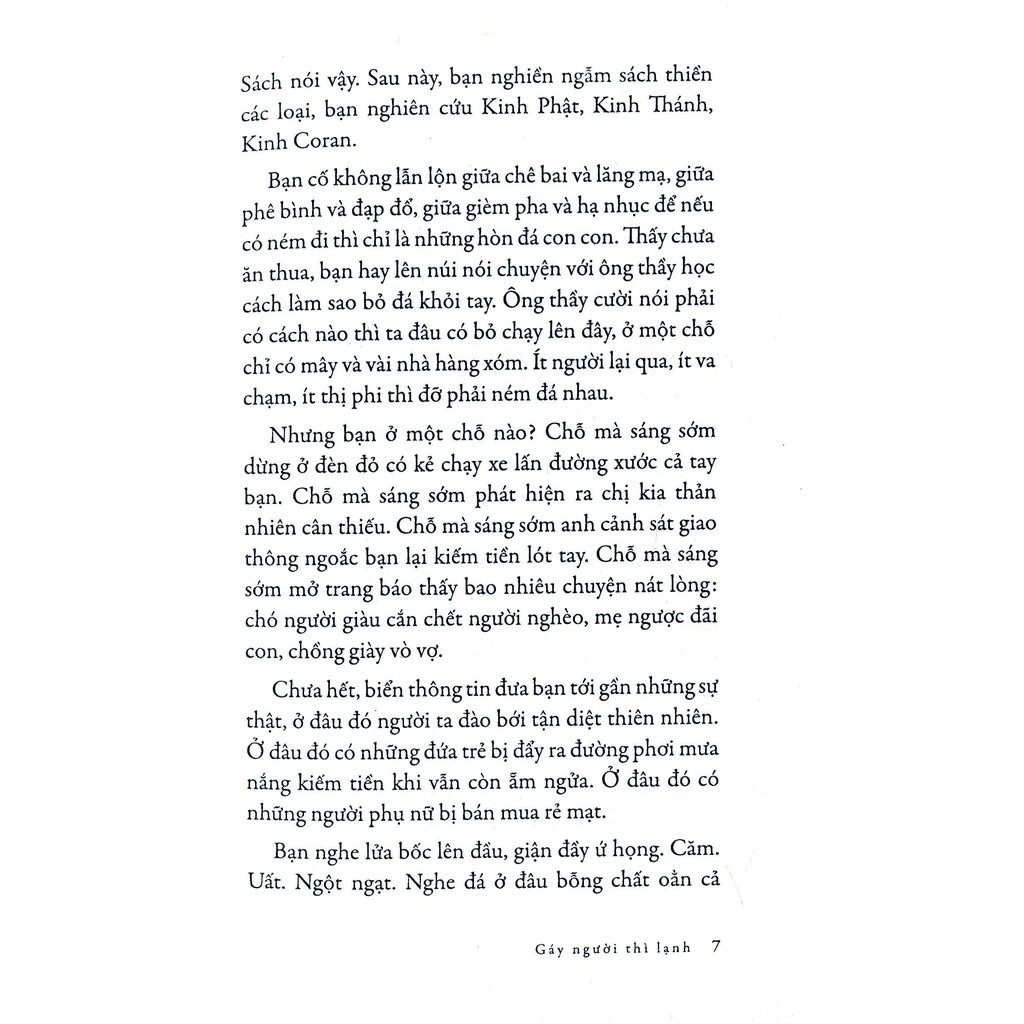 Quá khứ là kỷ niệm ấm áp, còn tương lai là những khát khao. Giữa hai miền thời gian đó, những chuyến dong ruổi, dù ngắn, qua ngóc ngách của làng quê hiện tại, đã giúp nhà văn viết nên những chi tiết hiện thực gây nhói buốt. “Gáy người thì lạnh” giống như những lời trần tình (hay tự vấn) của tác giả, đồng thời cũng là chia sẻ đến những ai mong được kết nối với tự nhiên, thèm được thở “những thứ khí trời bên ngoài cánh cửa”.Mời bạn đón đọc. Tác giả: Nguyễn Ngọc Tư Nhà Xuất Bản: Nxb Trẻ Nhà Phát Hành: NXB Trẻ Năm Xuất Bản: 2017 Số Trang: 152