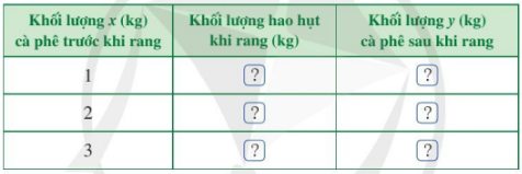 | Khối lượng x (kg) cà phê trước khi rang | Khối lượng hao hụt khi rang (kg) | Khối lượng y (kg) cà phê sau khi rang |
