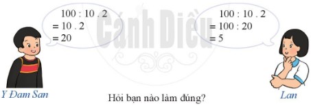 Hai bạn Lan và Y Đam San tính giá trị của biểu thức 100 : 10 . 2 như sau: