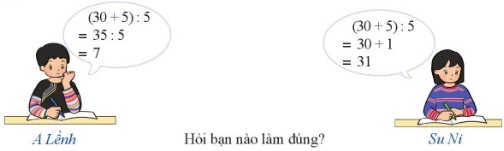 Hai bạn A Lềnh và Su Ni tính giá trị của biểu thức (30 + 5) : 5 như sau: