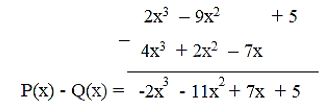 $= 2x^3 – 9x^2 + 5 – (2x^2 + 4x^3 – 7x)$