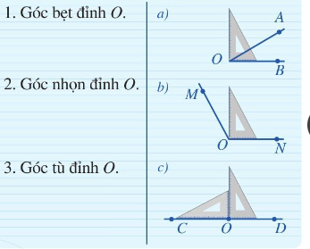 Đo các góc sau đây và cho biết số đo của chúng. Xác định góc nhọn, góc vuông góc tù, góc bẹt trong các góc đó.