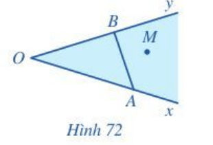 a) Hãy vẽ góc xOy. Lấy điểm A thuộc tia Ox, điểm B thuộc tia Oy (A, B khác O). Sau đó, tô màu phần mặt phẳng giới hạn bởi hai tia Ox và Oy mà chứa đoạn thẳng AB như Hình 72.