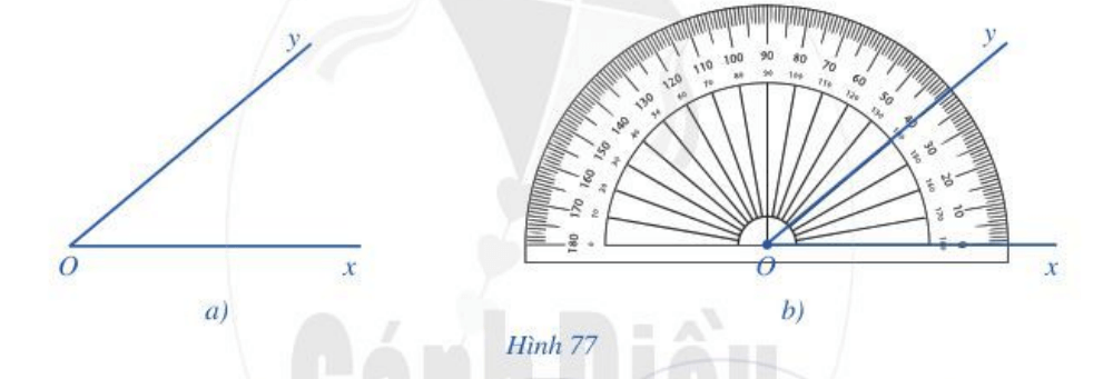 b) Dùng thước đo góc để xác định số đo góc xOy trong Hình 77a.