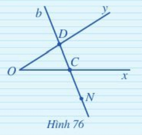 Cho góc xOy và điểm N không nằm trong góc đó. Giả sử đường thẳng b đi qua N lần lượt cắt tia Ox, Oy tại C, D (Hình 76). Nêu vị trí của điểm N đối với hai điểm C, D.
