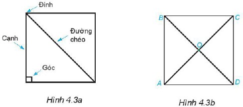 (1) Nêu tên các đỉnh, cạnh, đường chéo của hình vuông ABCD (H.4.3b)