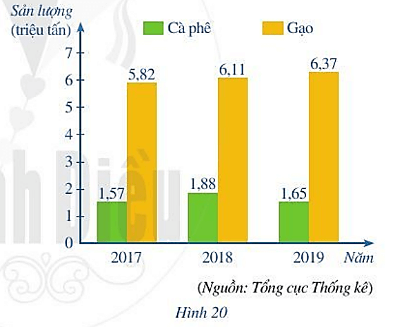 Biểu đồ cột kép ở Hình 20 biểu diễn sản lượng cà phê và gạo xuất khẩu của Việt Nam trong ba năm 2017, 2018, 2019.