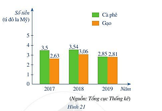 Biểu đồ cột kép ở Hình 21 biểu diễn số tiền Việt Nam thu được khi xuất khẩu cà phê và xuất khẩu gạo trong ba năm 2017, 2018, 2019.