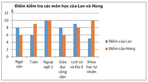 Đọc biểu đồ cột kép biểu diễn điểm kiểm tra các môn học của hai bạn Lan và Hùng sau đây và nêu nhận xét của em.