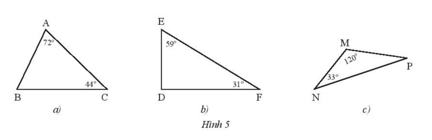 Tìm số đo các góc chưa biết của các tam giác trong Hình 3 và cho biết tam giác nào là tam giác nhọn, tam giác nào là tam giác tù, tam giác nào là tam giác vuông.