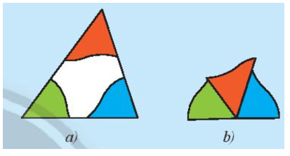 a) Cắt một tấm bìa hình tam giác và tô màu ba góc của nó (Hình 1a). Cắt rời ba góc ra khỏi tam giác rồi đặt ba góc kề nhau (Hình 1b).