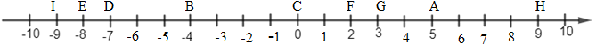Các điểm A, B, C, D, E, F, G, H, I lần lượt biểu diễn cho các số nguyên +5; -4; 0; -7; -8; 2; 3; 9; -9.
