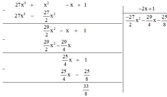 Vậy \((27x^3 + x^2 – x + 1):( – 2x + 1) = \frac{- 27}{2}x^2 – \frac{29}{4}x – \frac{25}{8}\) (dư $\frac{33}{8}$).