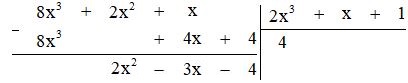 Hay $8x^3 + 2x^2 + x = 4(2x^3 + x + 1) + (2x^2 – 3x – 4)$.