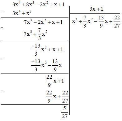 Vậy \((3{x^4} + 8{x^3} – 2{x^2} + x + 1):(3x + 1) = (x^3 + \frac{7}{3}x^2 – \frac{13}{9}x + \frac{22}{27}\) (dư $ \frac{5}{27}$).