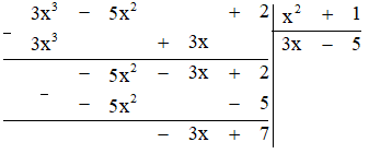 Vậy $(3x^3 – 5x^2 + 2) : (x^2 + 1) = (3x – 5)$ (dư $-3x + 7$).