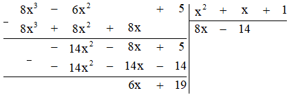 Nói cách khác, ta có: \((8{x^3} – 6{x^2} + 5) = ({x^2} + x + 1)(8x – 14) + (6x + 19)\)
