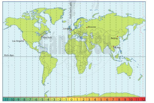 c) Biết thời gian ở Hà Nội đang là 8 giờ sáng, hãy tính giờ ở Bắc Kinh, Mát-xcơ-va, Luân Đôn, Niu Oóc, Lốt An-giơ-lét.