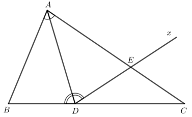 b) Kẻ tia Dx nằm trong góc ADC sao cho \(\widehat {ADx} = \widehat {ADB}\). Giả sử tia Dx cắt cạnh AC tại điểm E. Chứng minh: \(\Delta ABD = \Delta AED, AB < AC\).