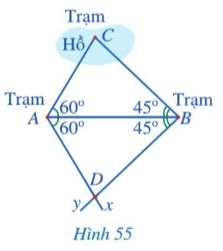 Người ta muốn đo khoảng cách từ A và từ B đến C. Do không thể đo trực tiếp được các khoảng cách trên nên người ta làm như sau (Hình 55):