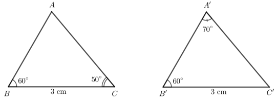 Cho hai tam giác ABC và A’B’C’ thỏa mãn: BC = B’C’ = 3 cm, \(\widehat B = \widehat {B’} = 60^\circ ,\widehat C = 50^\circ ,\widehat {A’} = 70^\circ \). Hai tam giác ABC và A’B’C’ có bằng nhau không? Vì sao?