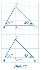 Cho hai tam giác ABC và A’B’C’ (Hình 57) có: \(\widehat A = \widehat {A’} = 60^\circ \), AB = A’B’ = 3 cm, \(\widehat B = \widehat {B’} = 45^\circ \). Bằng cách đếm số ô vuông, hãy so sánh BC và B’C’. Từ đó có thể kết luận được hai tam giác ABC và A’B’C’ bằng nhau hay không?