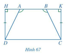 Cho Hình 67 có \(\widehat {AHD} = \widehat {BKC} = 90^\circ ,DH = CK,\widehat {DAB} = \widehat {CBA}\). Chứng minh AD = BC.