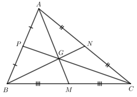 $\dfrac{{GA}}{{AM}} = \dfrac{{GB}}{{BN}} = \dfrac{{GC}}{{CP}} = \dfrac{2}{3}\\ \to GA = \dfrac{2}{3}AM;GB = \dfrac{2}{3}BN;GC = \dfrac{2}{3}CP$