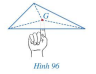 Hình 96 minh họa một miếng bìa phẳng có dạng hình tam giác đặt thăng bằng trên đầu ngón tay tại điểm G.
