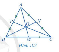 Quan sát các đường trung tuyến AM, BN, CP của tam giác ABC trong Hình 102, cho biết ba đường trung tuyến đó có cùng đi qua một điểm hay không.