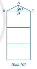Hình 107 là mặt cắt đứng của một ngôi nhà ba tầng có mái dốc. Mỗi tầng cao 3,3 m. Mặt cắt mái nhà có dạng tam giác ABC cân tại A với đường trung tuyến AH dài 1,2 m. Tại vị trí O là trọng tâm tam giác ABC, người ta làm tâm cho một cửa sổ có dạng hình tròn.