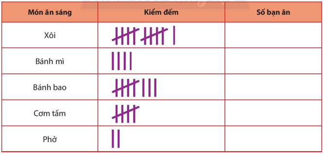 Lan muốn tìm hiểu về món ăn sáng nay của các bạn trong lớp. Em hãy giúp Lan hoàn thành công việc.