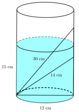 Trong một thí nghiệm khoa học, bạn Duy đặt hai chiếc đũa thủy tinh, một chiếc dài 14 cm và một chiếc dài 30 cm vào một bình thủy tinh có dạng hình trụ đựng dung dịch, cả hai đũa đều chạm đáy bình. Đường kính của đáy bình là 12 cm, chiều cao của dung dịch trong bình là 15 cm (bỏ qua bề dày của bình). Hỏi bạn Duy có thể cầm vào chiếc đũa thủy tinh nào mà ngón tay không bị chạm vào dung dịch? Vì sao?