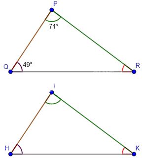 Cho biết \(\Delta PQR = \Delta IHK\), \(\widehat P = 71^\circ, \widehat Q = 49^\circ \). Tính số đo góc K của tam giác IHK.
