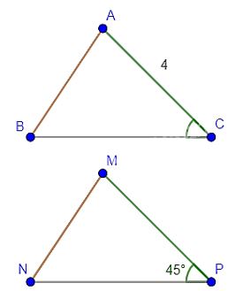 Cho biết \(\Delta ABC = \Delta MNP\), \(AC = 4\) cm, \(\widehat {MPN} = 45^\circ \). Tính độ dài cạnh MP và số đo góc ACB.