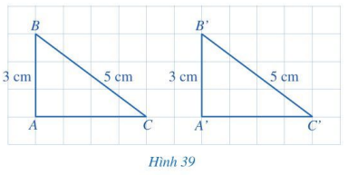 Cho hai tam giác vuông ABC và A’B’C’ có: \(\widehat A = \widehat {A’} = 90^\circ, AB = A’B’ = 3\) cm, \(BC = B’C’ = 5\) cm (Hình 39). So sánh độ dài các cạnh AC và A’C’.