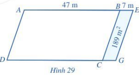 Một mảnh đất hình bình hành ABCD với AB = 47 m. Người ta mở rộng mảnh đất này thành hình bình hành AEGD có diện tích lớn hơn diện tích mảnh đất ban đầu là 189 m2 và BE = 7 m (Hình 29). Tính diện tích mảnh đất ban đầu.