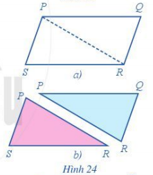 b) Cắt hình bình hành PQRS theo đường chéo PR thành hai tam giác PQR (tô màu xanh) và tam giác RSP (tô màu hồng) (Hình 24 a, b). Dịch chuyển tam giác màu xanh cho trùng với tam giác màu hồng, trong đó đỉnh Q trùng với đỉnh S.