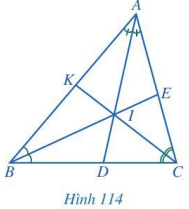 Quan sát các đường phân giác AD, BE, CK của tam giác ABC (Hình 114), cho biết ba đường phân giác đó có cùng đi qua một điểm hay không.