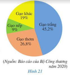 Năm 2020, Việt Nam xuất khẩu (ước đạt) 6,15 triệu tấn gạo, thu được 3,07 tỉ đô la Mỹ. Biểu đồ hình quạt tròn ở Hình 21 biểu diễn khối lượng xuất khẩu của mỗi loại gạo trong tổng số gạo xuất khẩu (tính theo tỉ số phần trăm).