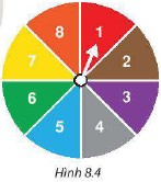 Một tấm bìa cứng hình tròn được chia làm 8 phần có diện tích bằng nhau và ghi số 1; 2; 3; 4; 5; 6; 7; 8 như Hình 8.4, được gắn vào trục quay có mũi tên ở tâm.