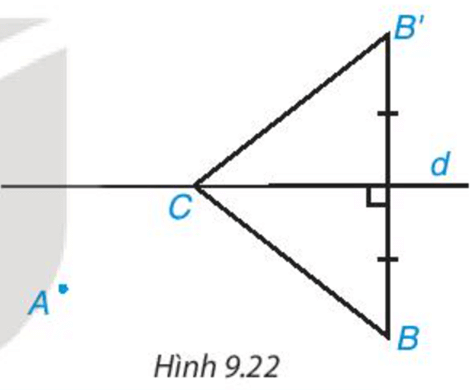 Hai khu vườn $A$ và $B$ nằm về một phía của con kênh $d$. Hãy xác định bên bờ kênh cùng phía với $A$ và $B$, một điểm $C$ để đặt máy bơm nước từ kênh tưới cho hai khu vườn sao cho tổng độ dài đường ống dẫn nước từ máy bơm đế hai khu vườn là ngắn nhất. (HD: Gọi $B’$ là điểm sao cho d là đường trung trực của $BB’$ (H.9.22). Khi đó $CB = CB’$. Xem Vận dụng, Bài 33).