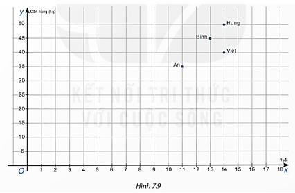 Cân nặng và tuổi của bốn bạn An, Bình, Hưng, Việt được biểu diễn trên mặt phẳng tọa độ như Hình 7.9.
