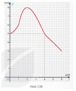 Hình 7.10 là đồ thị của hàm số mô tả nhiệt độ $T (°C)$ tại các thời điểm $t$ (giờ) của một thành phố ở châu Âu từ giữa trưa đến $6$ giờ tối.