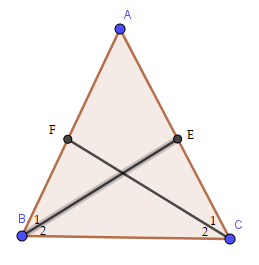 Gọi $BE$ và $CF$ là hai đường phân giác của tam giác $ABC$ cân tại $A$. Chứng minh $BE = CF$.