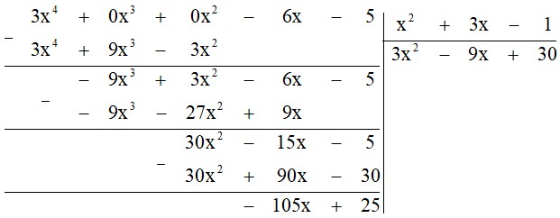 Vậy $A = (x^2 + 3x – 1) . (3x^2 – 9x + 30) -105x + 25$.