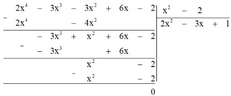 Tìm đa thức $P$ sao cho $A = B. P$, trong đó $A = 2x^4 – 3x^3 – 3x^2 + 6x – 2$ và $B = x^2 – 2$.