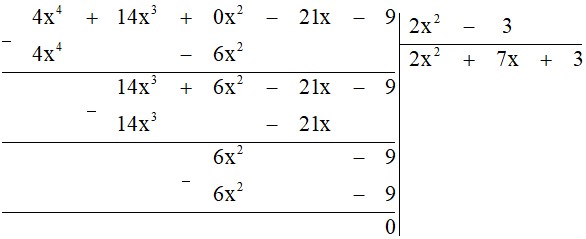 b) $(4x^4 + 14x^3 – 21x – 9) : (2x^2 – 3)$.